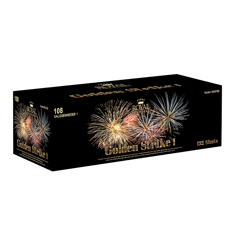 Compound batteri der opskyder 132 farverige luftbomber i en blanding af lodrette og vinklede skud. Bombetterne eksploderer i røde, grønne, blå og guld palmer, og afsluttes i en smuk finale. NEM: 1804 gram